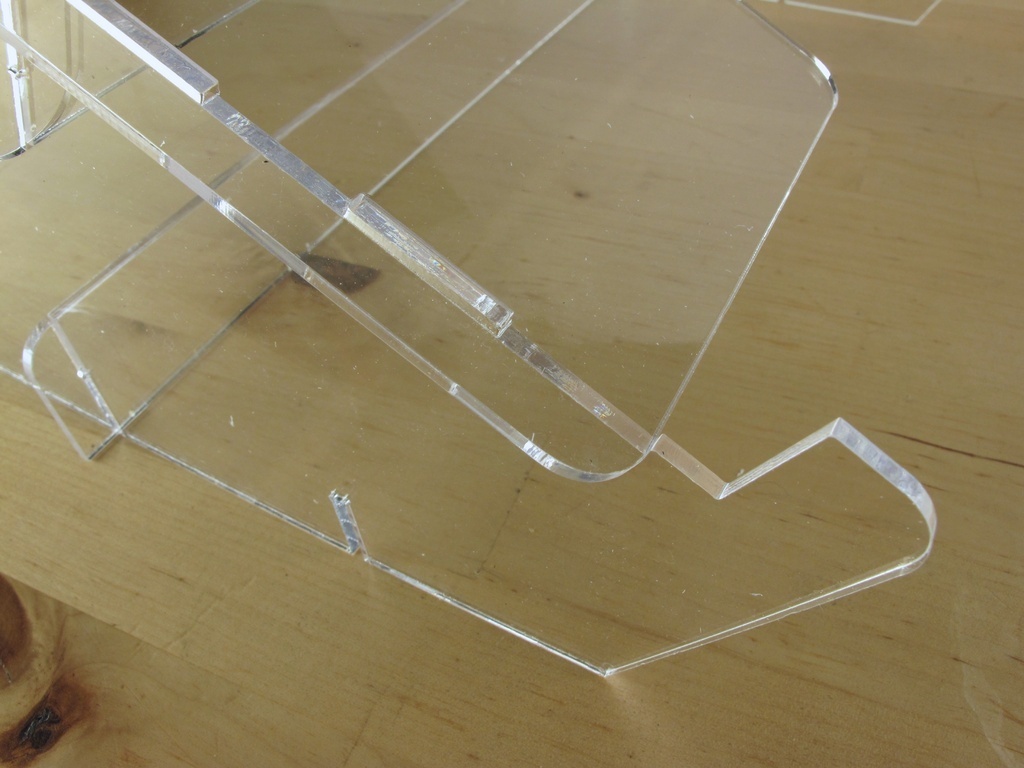 Slots shaped to reduce stress. As detailed here (http://blog.ponoko.com/2010/06/17/how-to-make-snug-joints-in-acrylic/), I added small radii to the slots to reduce the chances of the acrylic snapping.