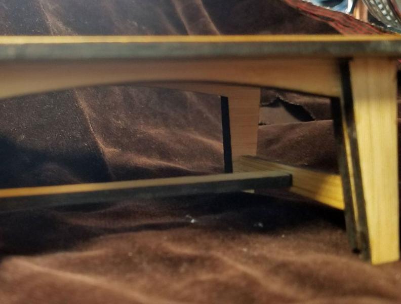 I wanted slightly heavier legs that tapered, and realized two layers of material would work to give a nice visual heft, and also to hide the holes needed for the cross-pieces stabilizing the legs. I am pleased with the arch visible behind the single legs.